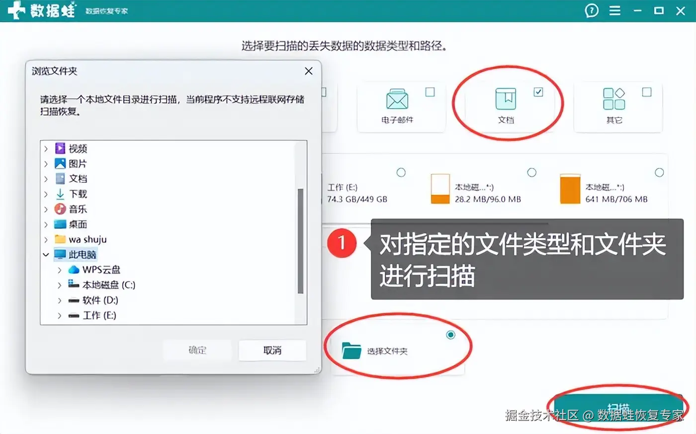 步骤2:双击桌面图标运行程序,接着在新页面中,你可以选择丢失数据的类型,然后点击 【选择文件夹】 ,指定扫描位置,并等待一段时间。