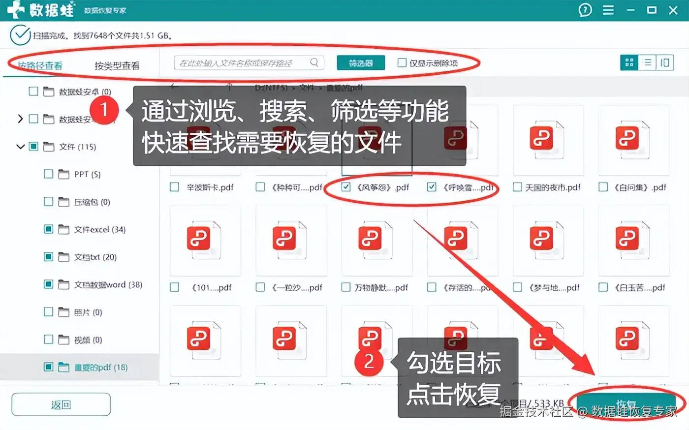 步骤3:扫描结束后,页面上会显示一份列表,你可以使用它提供的各项功能,快速定位到目标文件。最后,勾选你所需要找回的文件,点击 【恢复】 。