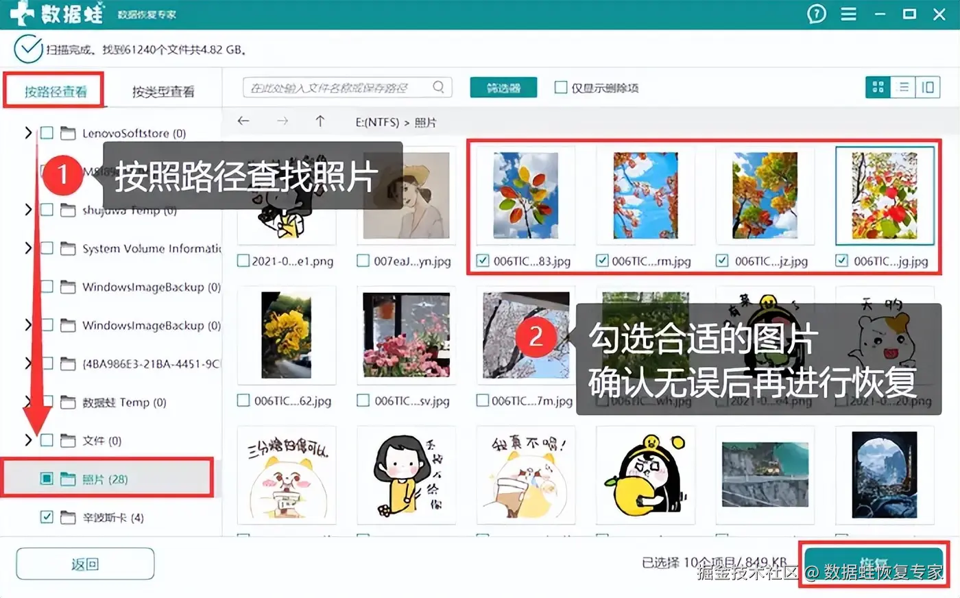第三步:你可以等待深度扫描完成后再进行恢复。如下图所示,在页面中选择 【按路径查看】 ,然后勾选需要找回的照片,最后点击 【恢复】 ,保存到合适的位置就好。