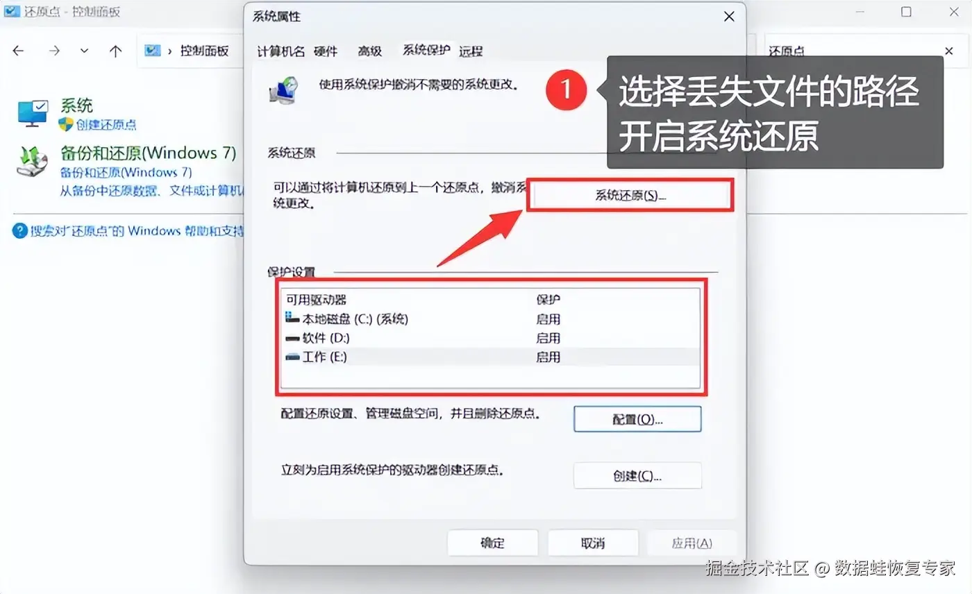 回收站只是基础技巧,如果想要寻找更高级一些的时光机器,不妨看看还原点。通过创建和使用系统还原点,我们可以轻松将电脑恢复到某个时间点,从而找回删除文件。操作起来也非常简单,只需按照系统提示,选择丢失文件的路径,然后点击 【系统还原】 ,就可完成。