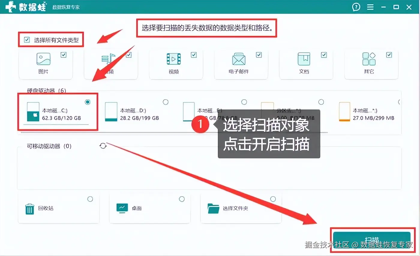 步骤1:选择需要恢复数据的类型,并确定磁盘分区或文件夹,勾选必要条件后,点击 【扫描】 。