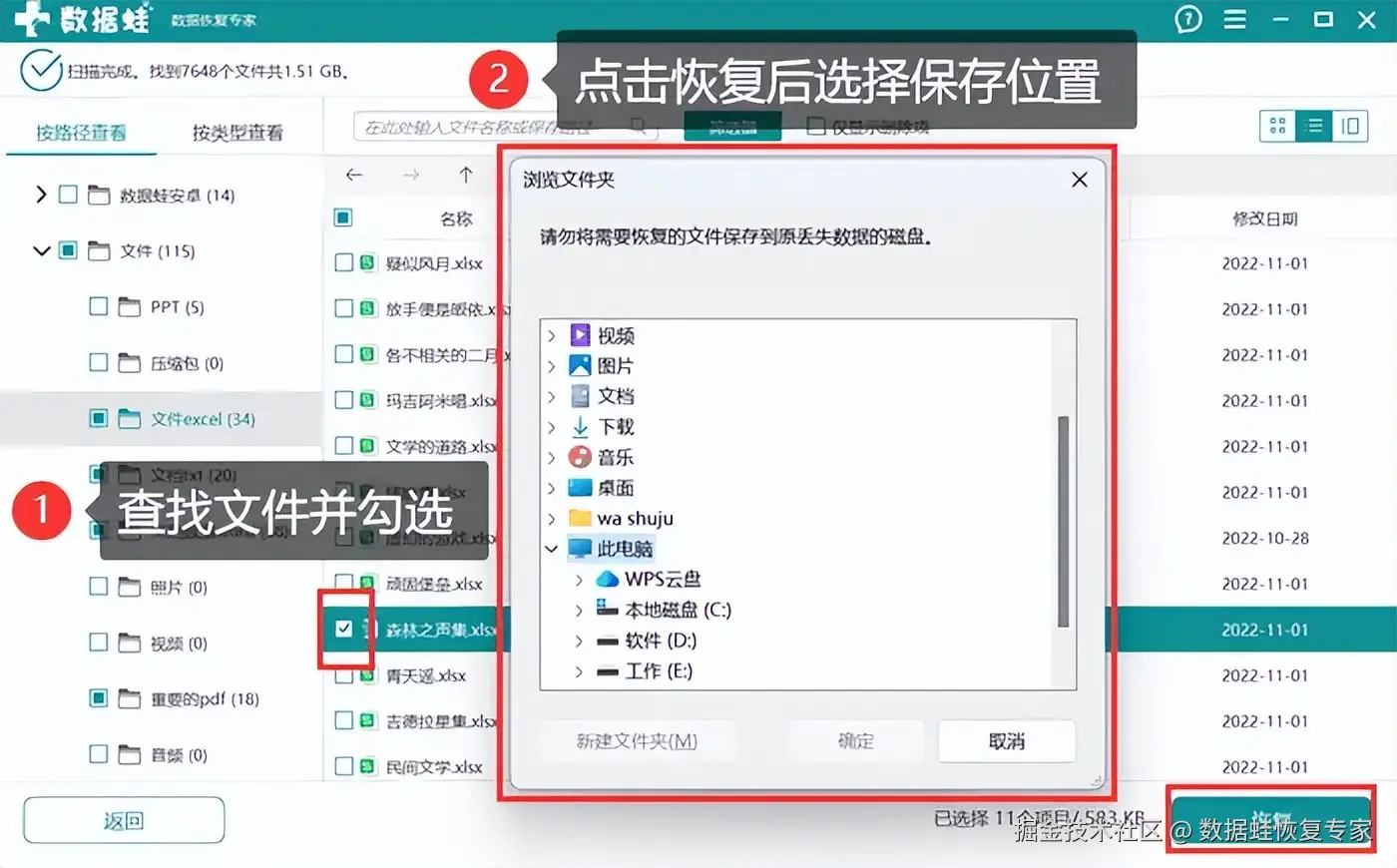 步骤2:对指定数据扫描完毕后,你可以在列表中查看结果,并通过浏览、搜索、筛选等方式快速定位。最后,勾选项目,点击 【恢复】 ,在弹出框中选择保存位置。