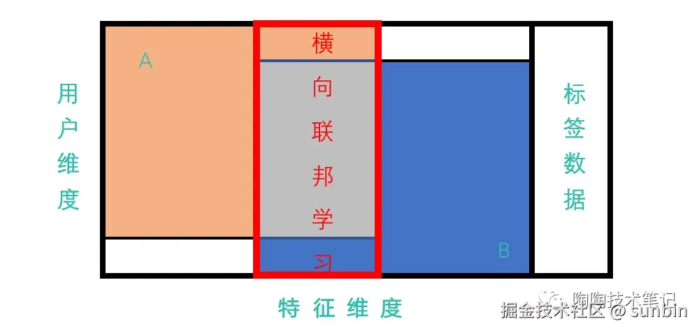 例如:同一地区的商场与银行,它们的用户群体很有可能包含该地的大部分居民,用户的交集可能较大;由于银行记录的都是用户的收支行为与信用评级,而商场则保有用户的购买历史,因此它们的用户特征交集较小;这种场景就比较适合使用 「纵向联邦」 用于增加模型训练的特征数量 「扩展模型能力」。