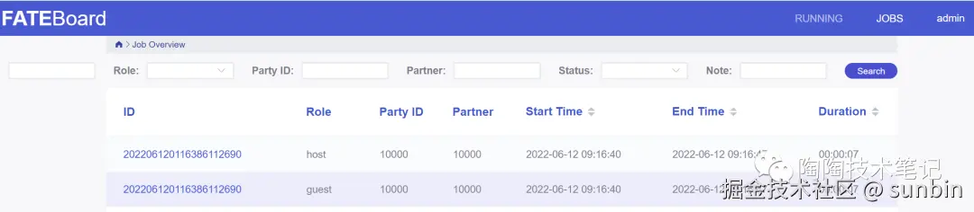 FATE Board 是 Fate 里面负责可视化的服务组件,在单机版容器中已经集成了该服务,可以通过 8080 端口访问: