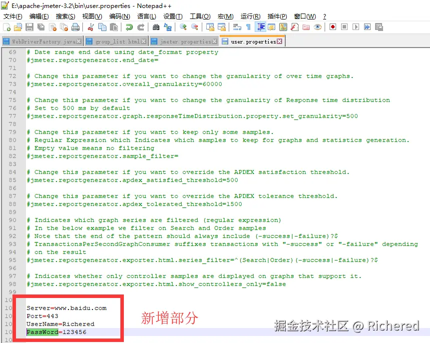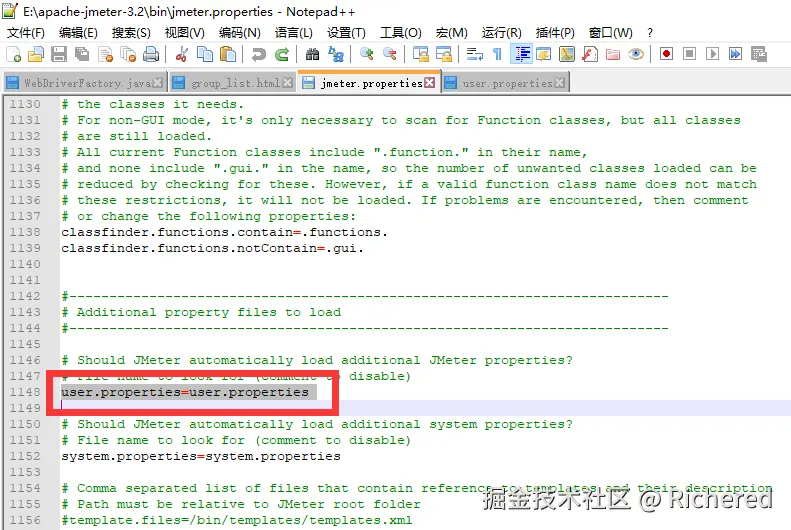 一、打开jmeter.Properties文件,找到user.properties=这一行