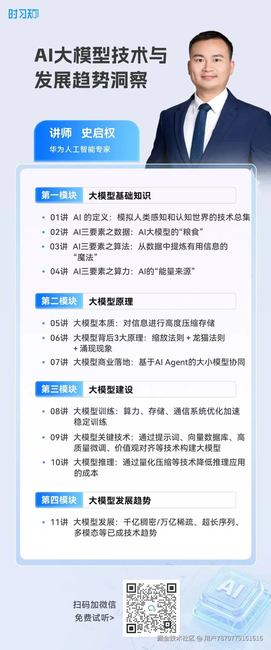 在时习知新上的 《AI大模型技术与发展趋势洞察》 这门课程中,你都能找到这些问题的答案,也能找到开头那些术语的解释。课程基于华为在大模型研究中的实践经验,深入剖析AI大模型的核心原理、关键技术及未来发展趋势。
