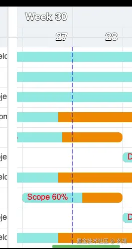在gantt甘特图中通常需要标记一些重要的日期,我们通过配置项markLine来配置该效果。通过markLine.date来指定重点日期,通过 markLine.style 配置项,可以自定义标记线的样式。如果需要将该日期在初始化时一定要展示出来可以设置markLine.scrollToMarkLine为true。
