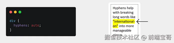 hyphens 属性会在行尾自动断开长单词,以提高文本的可读性。如果一个单词超出行的宽度,它会在适当的位置断开并移到下一行。