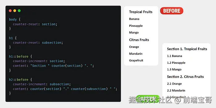 CSS counter 属性用于自定义数字并自动对 HTML 文档中的特定元素进行编号。此功能可用于向列表项或特定 HTML 元素添加数字。