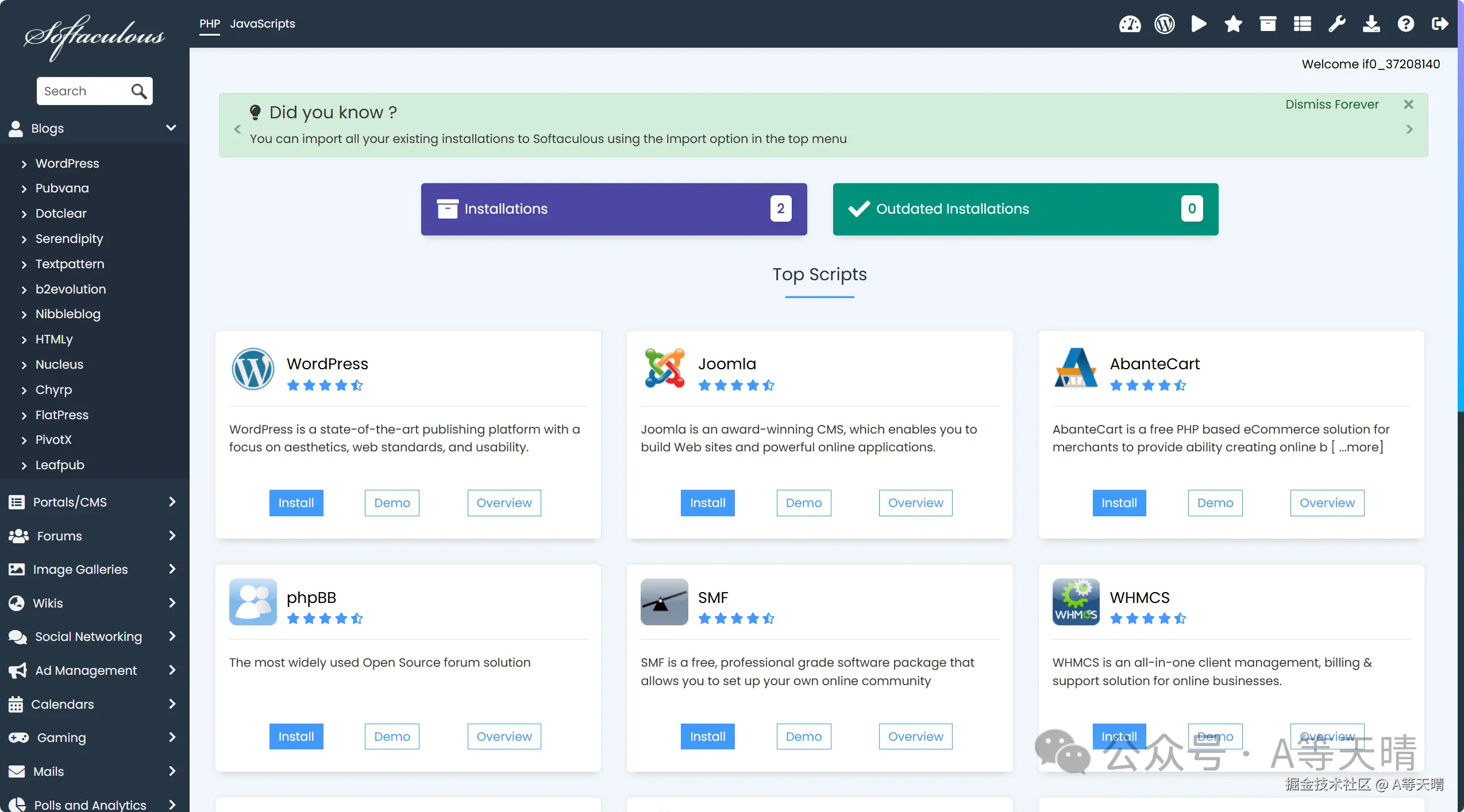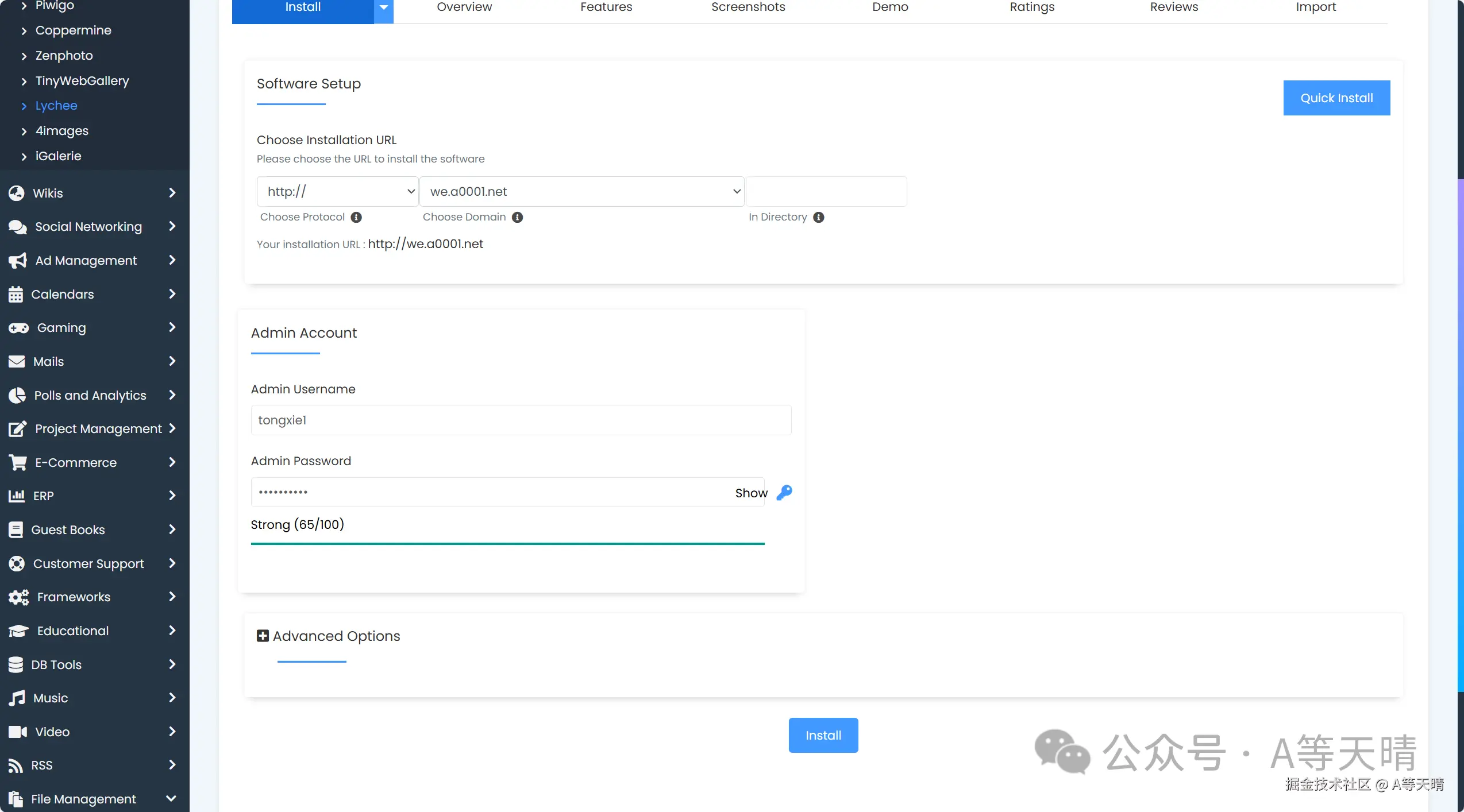 有很多的类型的站点,类似博客,图片网盘,项目管理等等,热门的脚本基本都集成在里面了,然后可以选择你要的一个软件,然后点install now,然后就可以选择域名填写你的后台管理员的账号密码