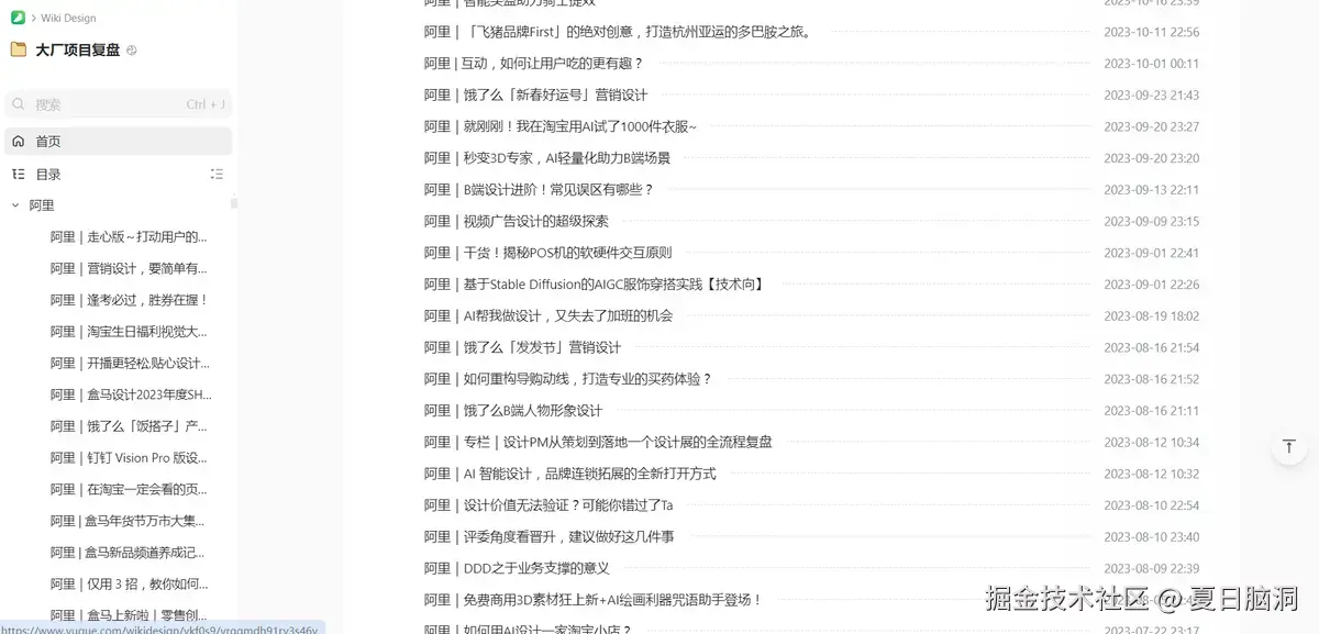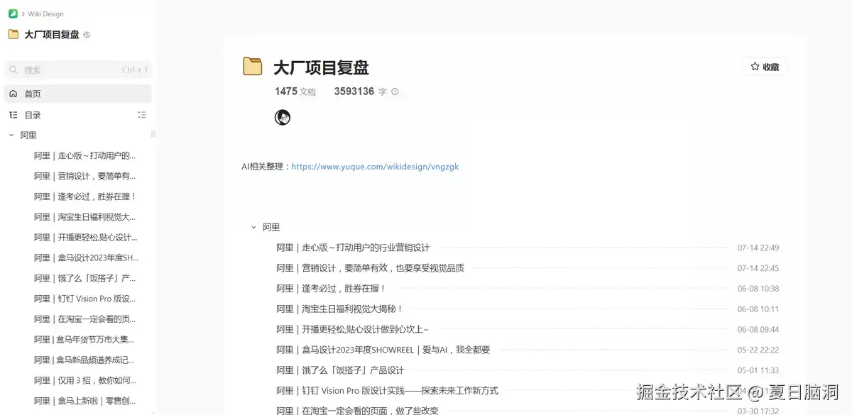 这是一份由Wiki Design精心整理的在线语雀文档,汇总了各大互联网大厂的项目复盘设计。内容涵盖了阿里、腾讯、京东、滴滴、百度、字节跳动、携程、小米等知名大厂的项目设计思路、构思与把控等宝贵知识。