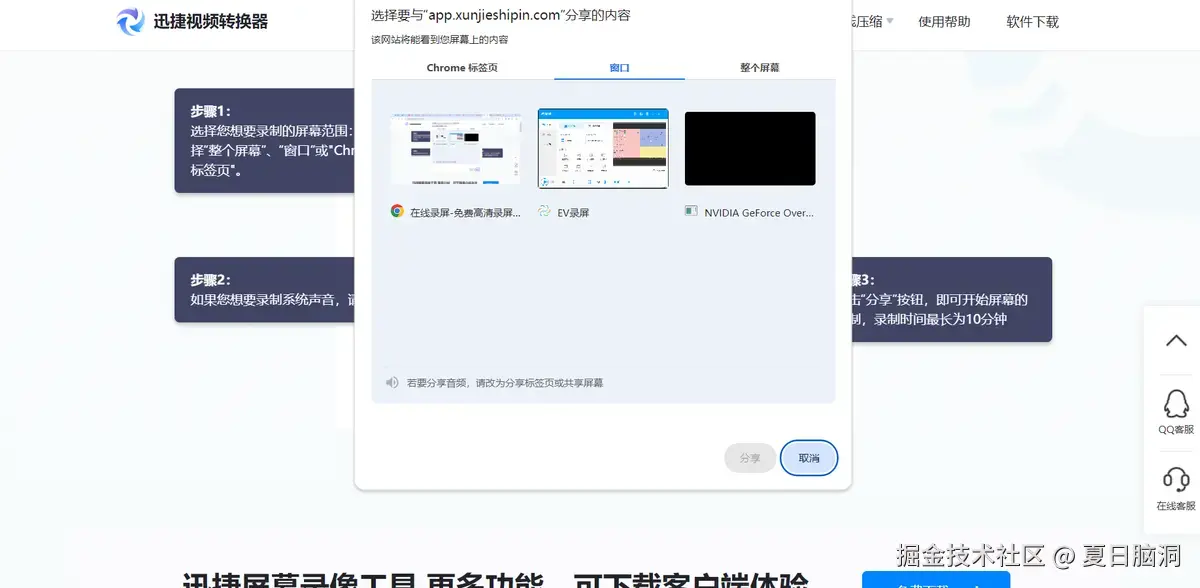 它提供了三种录制模式:全屏录制、窗口录制和浏览器标签页录制,并能自动识别页面大小,使用起来非常方便。不过,每次录制时长限制在10分钟。