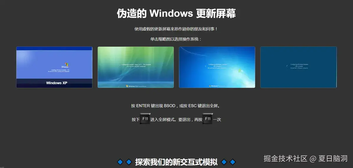 这个网站简直是摸鱼神器!它能让你的电脑屏幕看起来像是在系统升级。只需打开网页,选择一个升级界面,然后按下【F11】键进入全屏模式,这时整个屏幕都会显示出伪装的升级画面。