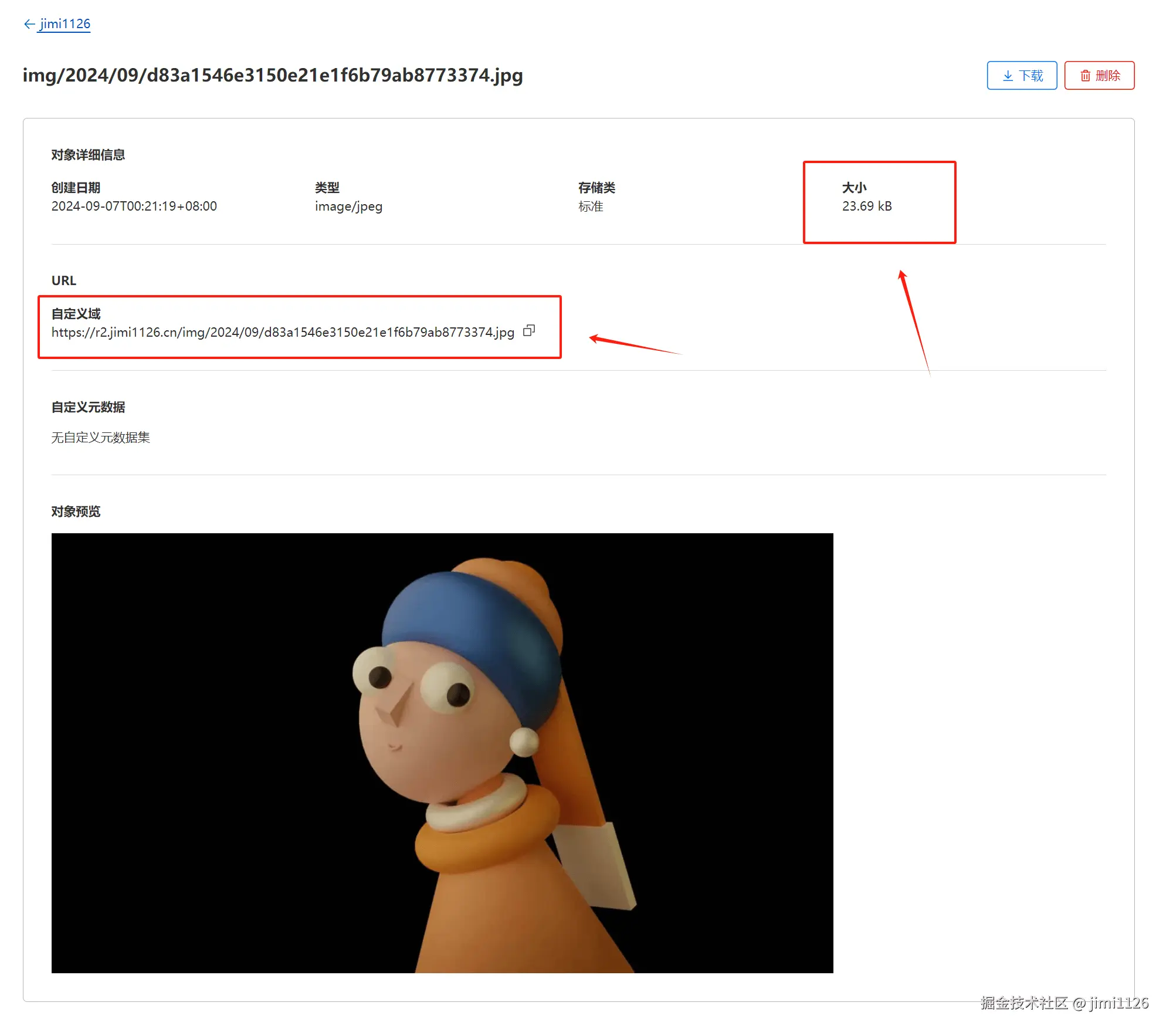 然后上 R2 找到这张图片点开看里面信息,可以看到大小被压缩到 23.69kb 了,压缩比杠杆的,公共访问链接也可以在这里找到。