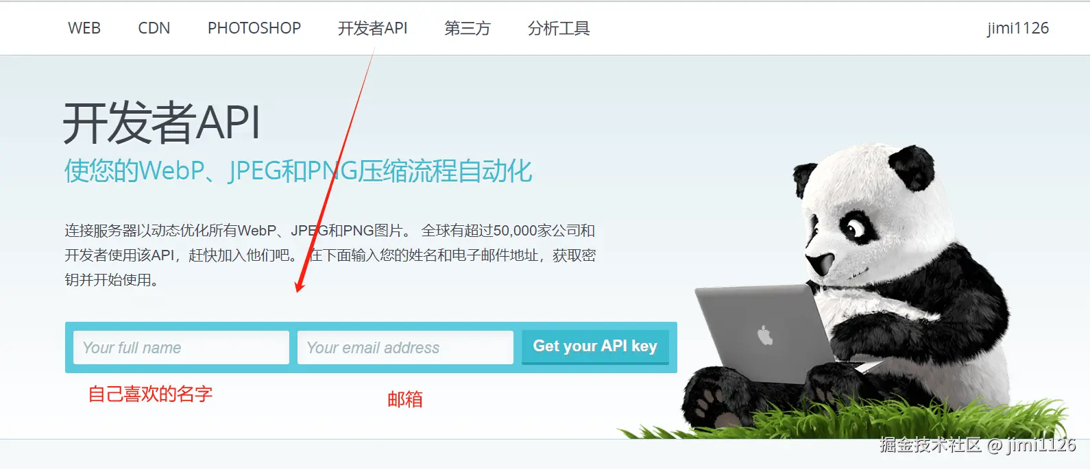 打开 tinypng 官网 ,然后选择【开发者 API】标签,输入个人信息,完成注册。
