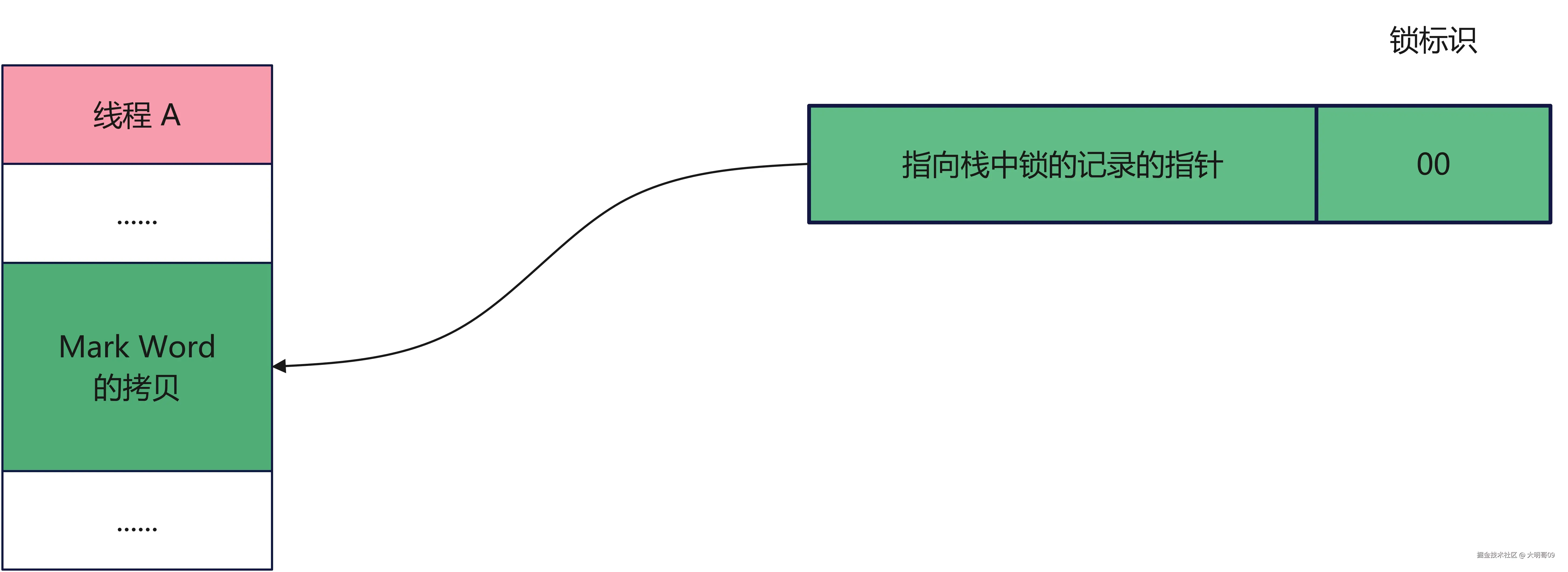 Lock Record),用于存放锁对象目前的 Mark Word 的拷贝,然后拷贝对象头中的 Mark Word 到线程 A 的锁记录中(官方称之为 Displaced Mark Word ),若拷贝成功,JVM 将使用 CAS 尝试将对象头重的 Mark Word 更新为指向线程 A 的Lock Record的指针,成功,线程 A 获取轻量级锁,此时 Mark Word 的锁标志位为 00,指向锁记录的指针指向线程 A 的锁记录地址,如下图: