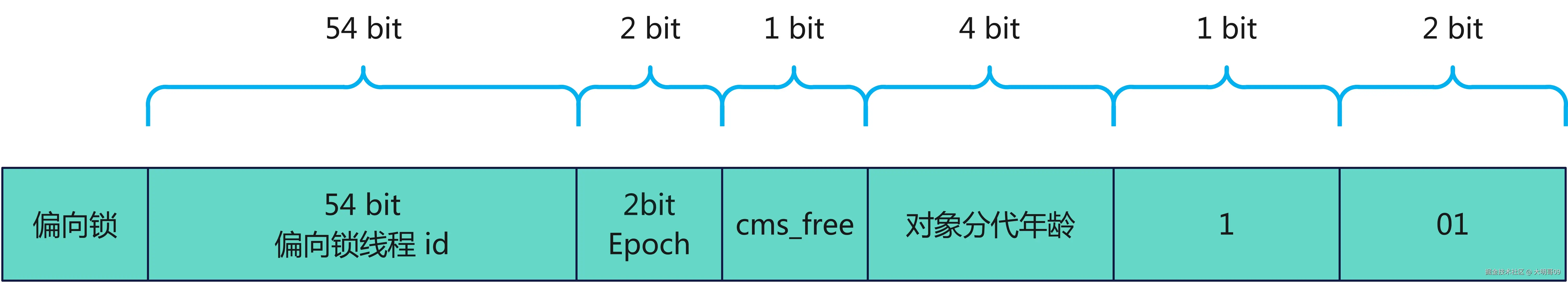 1000001)时,锁就会从无锁状态升级偏向锁。偏向锁会在 Mark Word 中的偏向锁线程 id 存储当前线程的id(1000001),偏向锁标识为 1,锁标识为 01,如下: