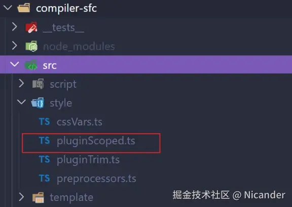 我们来看看 vue 源码中对 scoped 和 :deep 语法是怎么处理的:源码中 css 处理是通过一个自定义的 postcss 插件:pluginScoped.ts,文件位于compile-sfc包下: