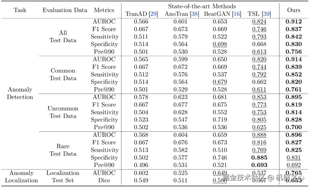 在异常检测性能评估上,研究团队提出的方法在大多数评价指标上均优于现有方法,涵盖所有测试数据集。具体来说,该方法实现了 91.2% 的 AUROC,83.7% 的 F1 分数,84.2% 的敏感性,83.0% 的特异性,以及在固定 90% 召回率下 75.6% 的精度,显著超越了其他竞争方法。该模型对细微信号模式变化的敏感性更高,能够比真实情况中的广泛标注更精确地定位异常。这些精准定位为潜在异常提供了宝贵的见解,从而为医疗从业者提供了显著支持。