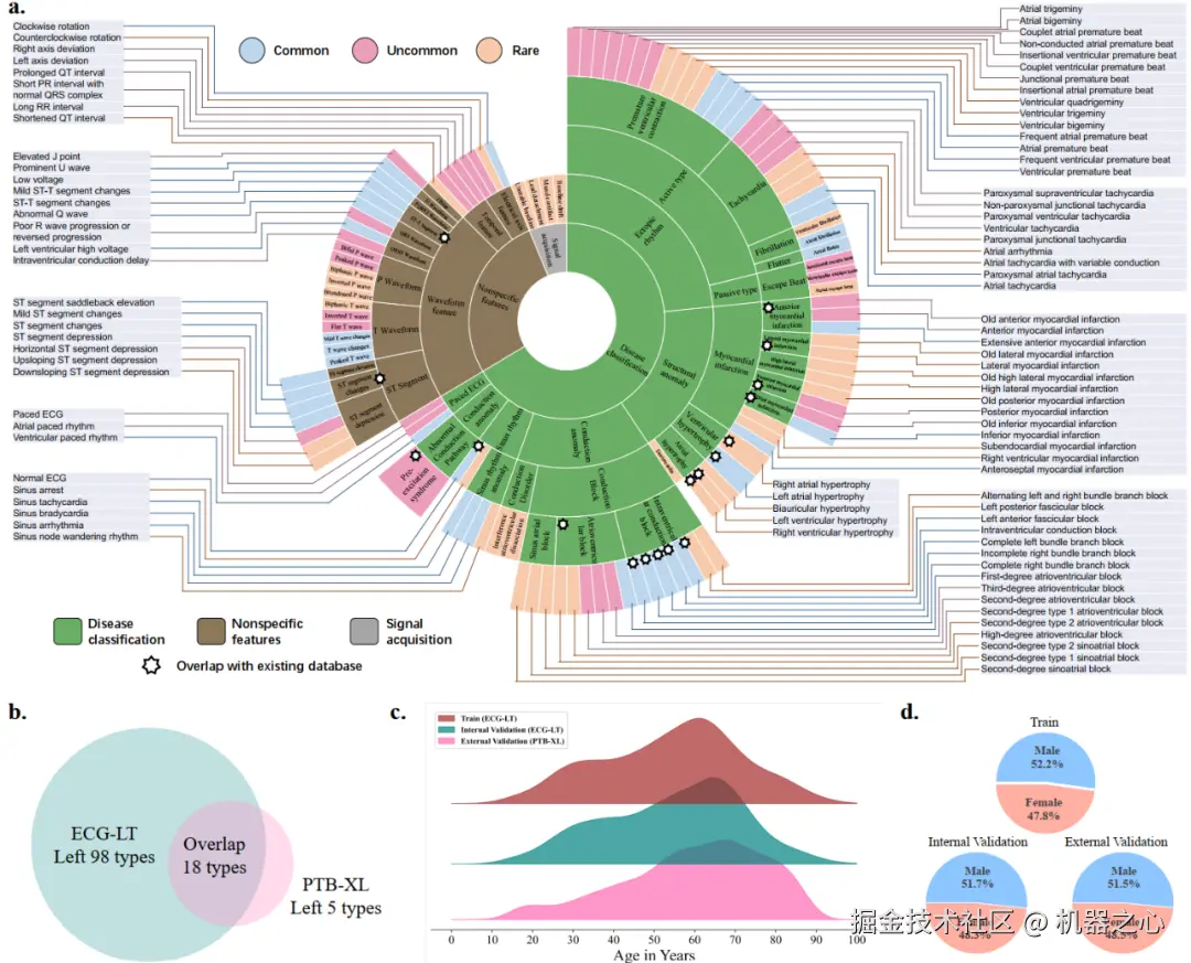 图二:数据集具体类型,年龄性别分布,与外部验证的开源数据集 PTB-XL 对比