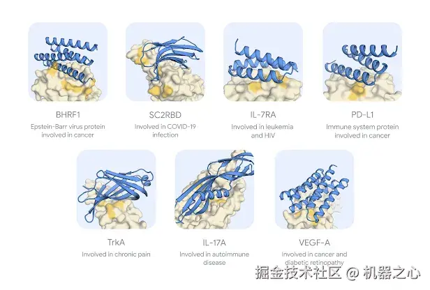 为了测试 AlphaProteo,研究人员设计了针对各种靶蛋白的结合剂,包括两种与感染有关的病毒蛋白 BHRF1 和 SARS-CoV-2 刺突蛋白受体结合域 SC2RBD,以及五种与癌症、炎症和自身免疫性疾病有关的蛋白 IL-7Rɑ、PD-L1、TrkA、IL-17A 和 VEGF-A。