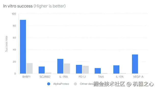 在测试的 7 种靶蛋白上,AlphaProteo 的实验成功率更高,在湿实验室中测试中,9% 到 88% 候选分子成功结合,这比其他方法高出 5 到 100 倍。而且,比现有最佳方法的结合亲和力高出 3 到 300 倍。