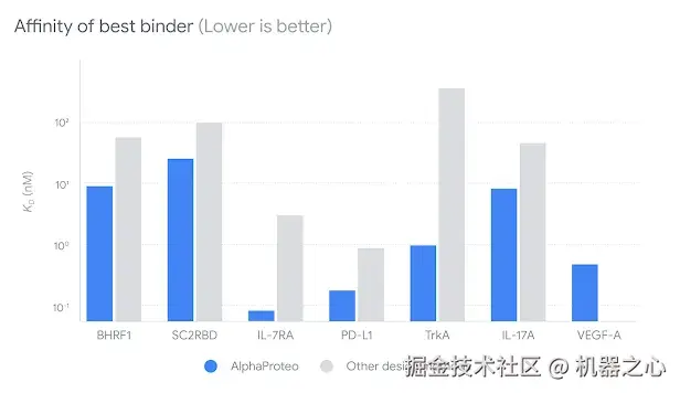 图示:与其他设计方法相比,AlphaProteo 的设计在未进行实验优化的情况下对七种目标蛋白的最佳亲和力。亲和力越低,意味着结合蛋白与目标蛋白的结合越紧密。(来源:论文)