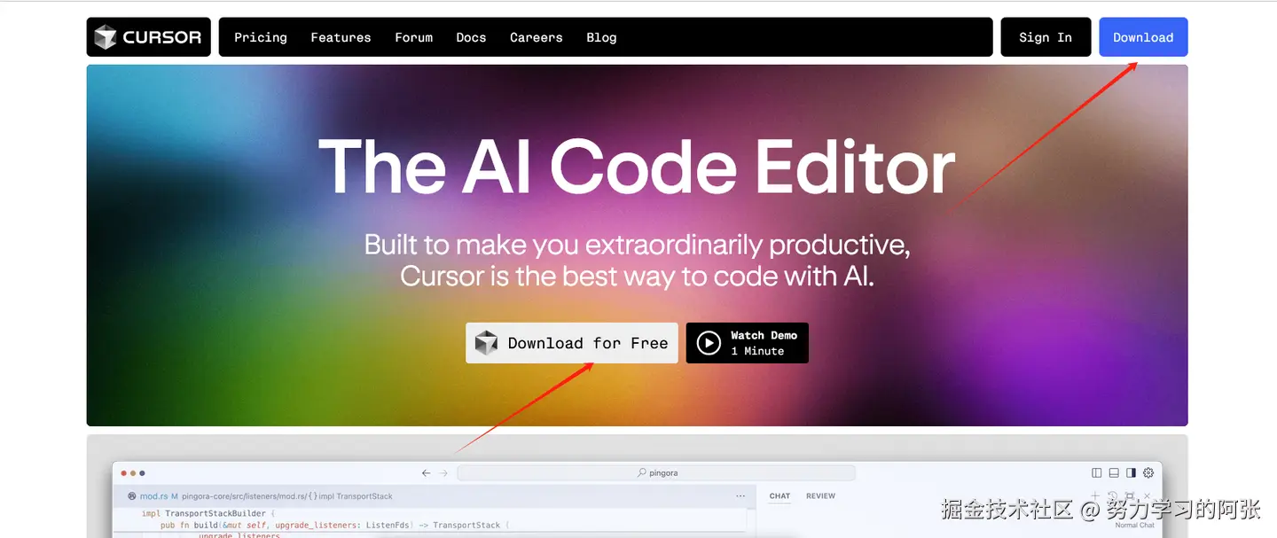 首先打开 Cursor 官方网站下载 Cursor 编辑器:cursor.com