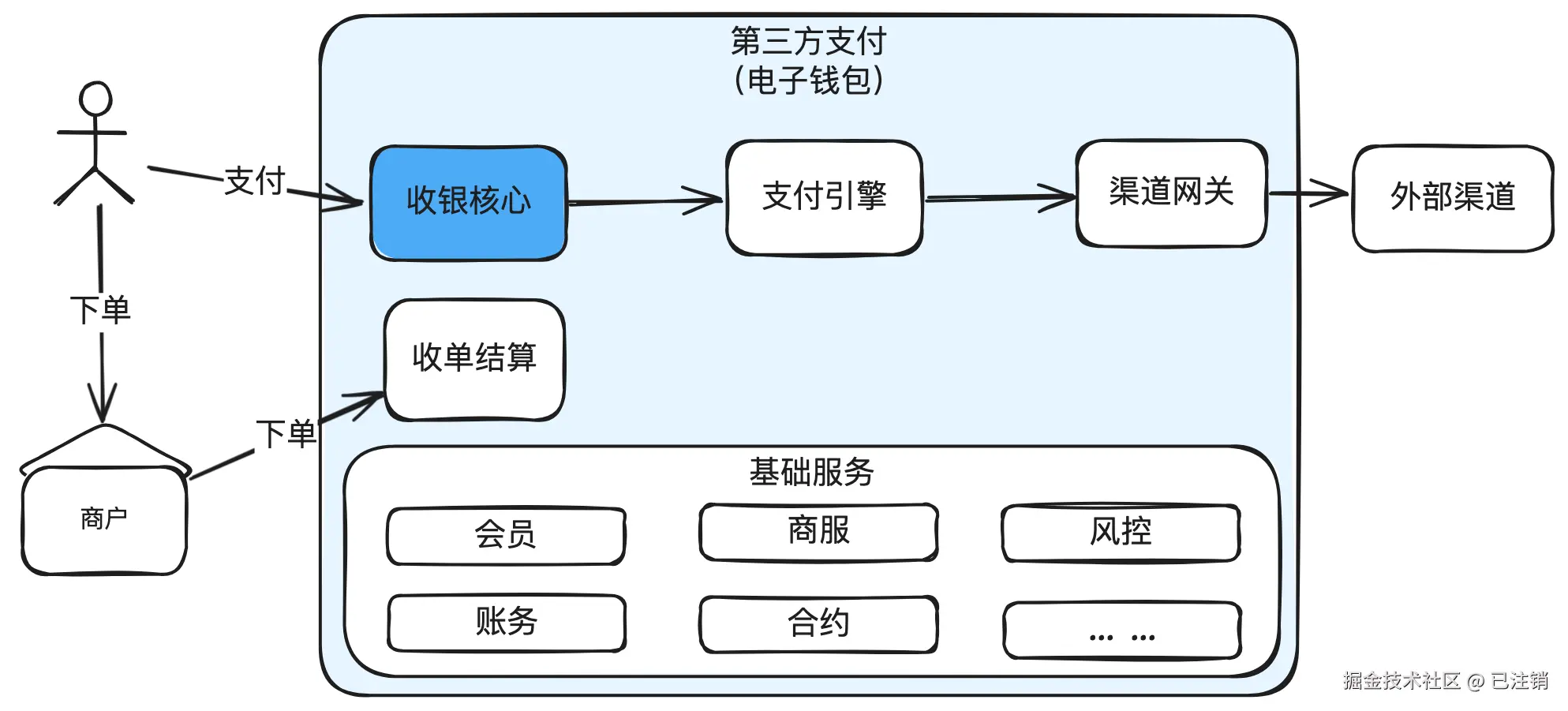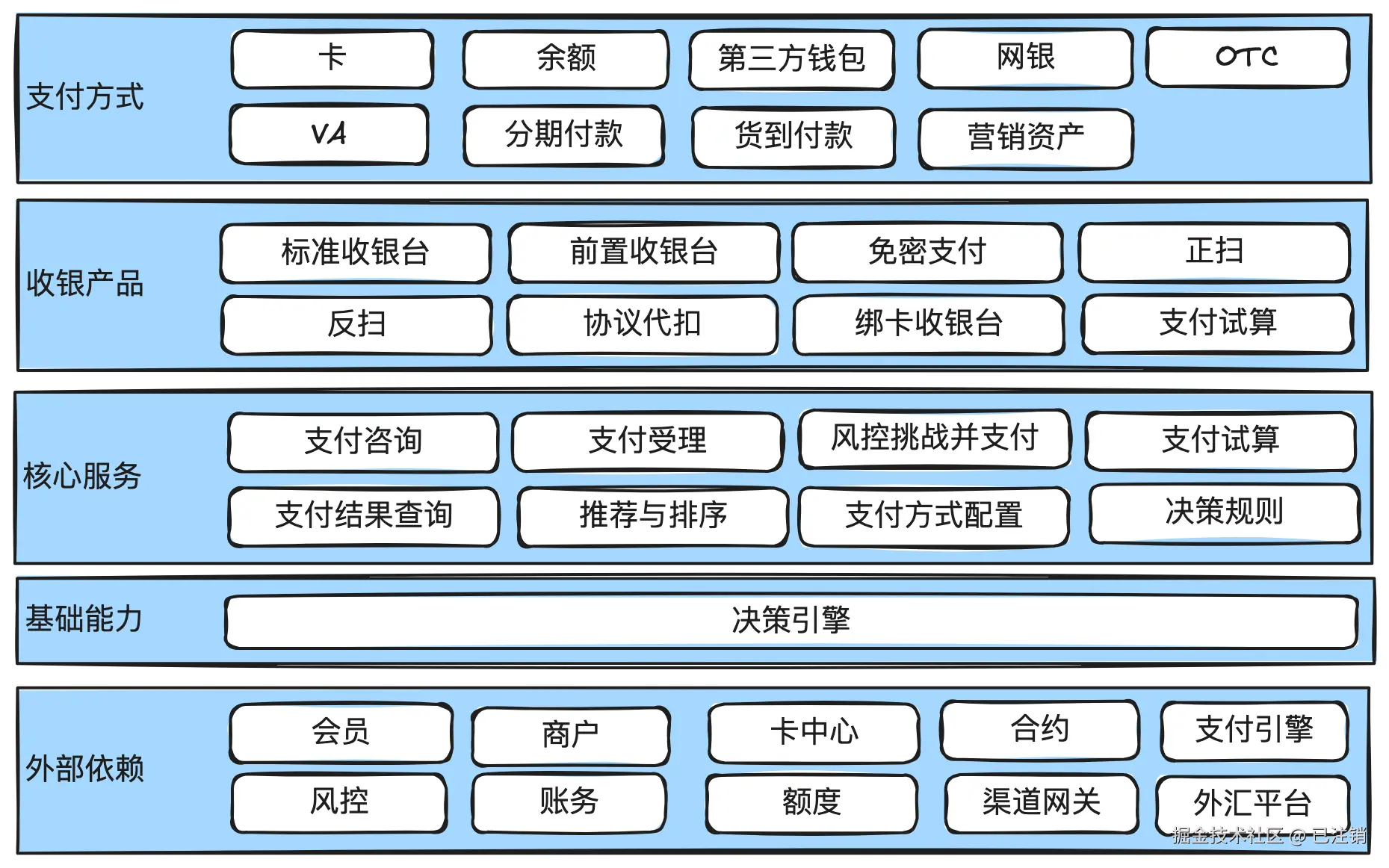 本篇主要讲清楚收银核心的设计与实现,包括收银核心如何渲染可用支付方式,如何做可支付检查,收银台核心的系统架构、领域模型,常见支付方式等。