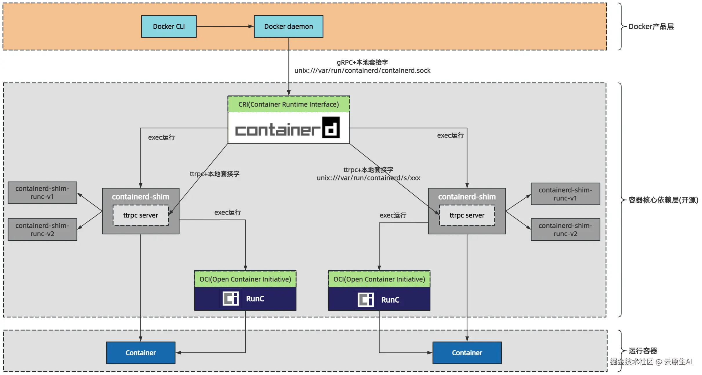 从上面架构图看较为复杂,涉及到组件包括:docker cli、daemon、containerd、containerd-shim、runc等,还涉及CRI、OCI两个容器运行时的协议规范,这套架构的背后还涉及到诸多历史原因,下面就来缕下它们的关系,可以对Docker的发展、容器技术的演进有更加清晰的认识。