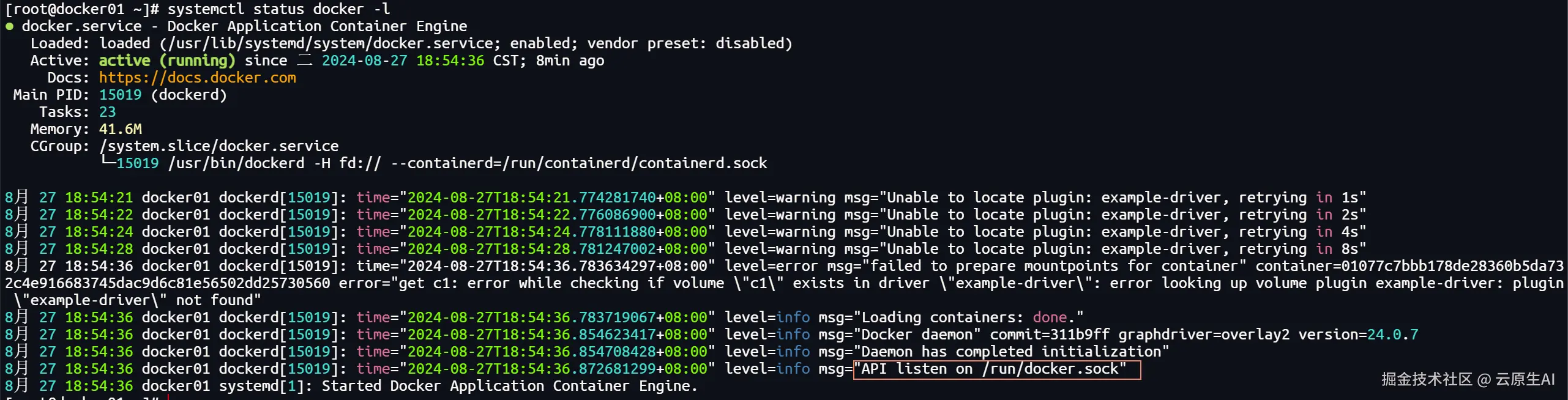 从上面启动日志最后一行"API listen on /run/docker.sock"可以看到daemon进程采用UNIX本地套接字,套接字文件为:/run/docker.sock。