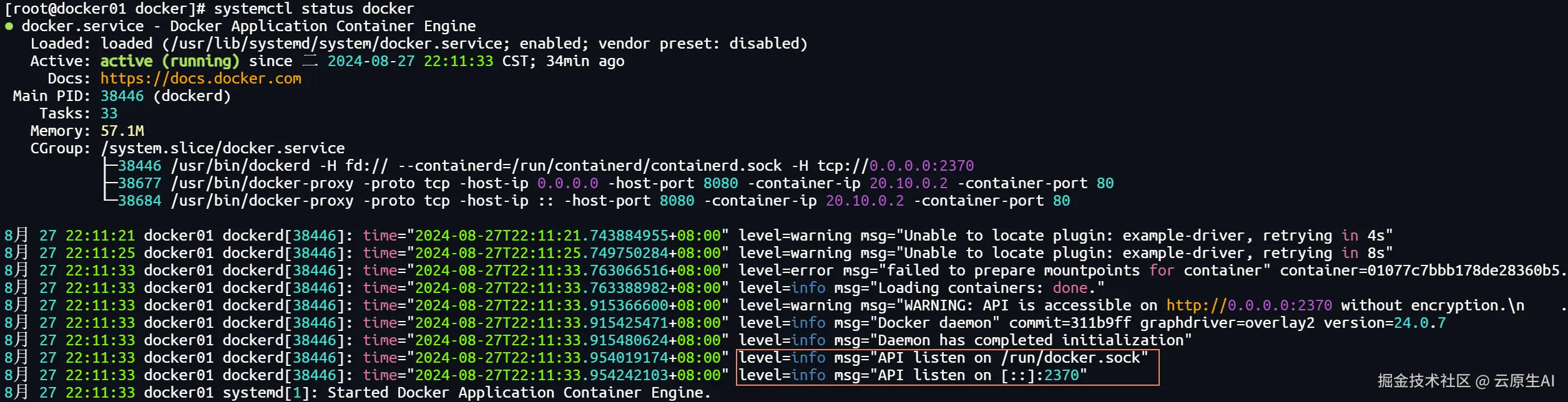 Docker客户端和后端daemon进程默认运行在同一台服务节点上,并采用UNIX本地套接字方式进行通信,这样可以省略掉网络协议栈流程,性能和安全性更高。可以查看Docker启动日志: