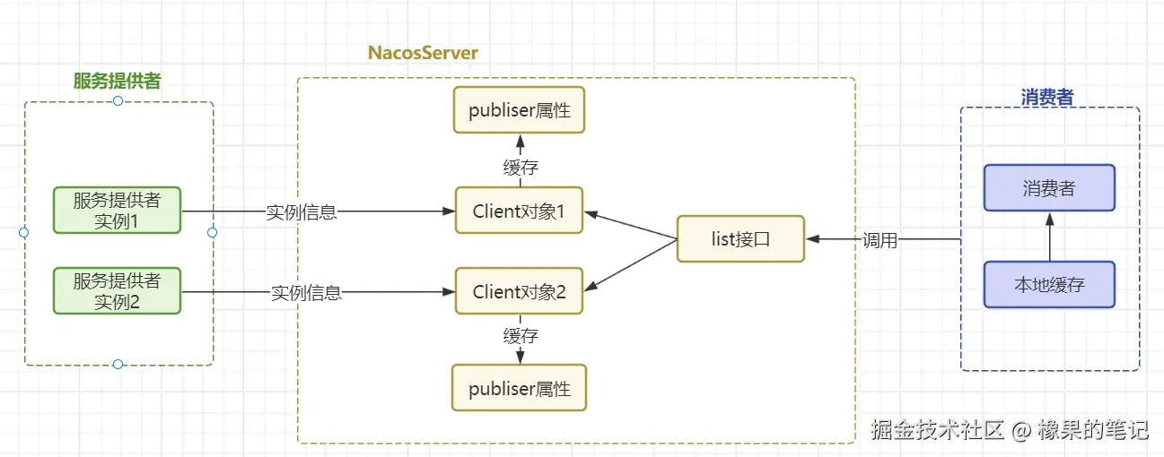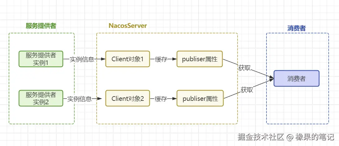 因为在前文说明过,服务实例就是由每个服务提供者实例对应的Client对象缓存到publiser属性中,所以这里消费者获取服务实例肯定最终是要从Client对象中获取。基本流程如下图: