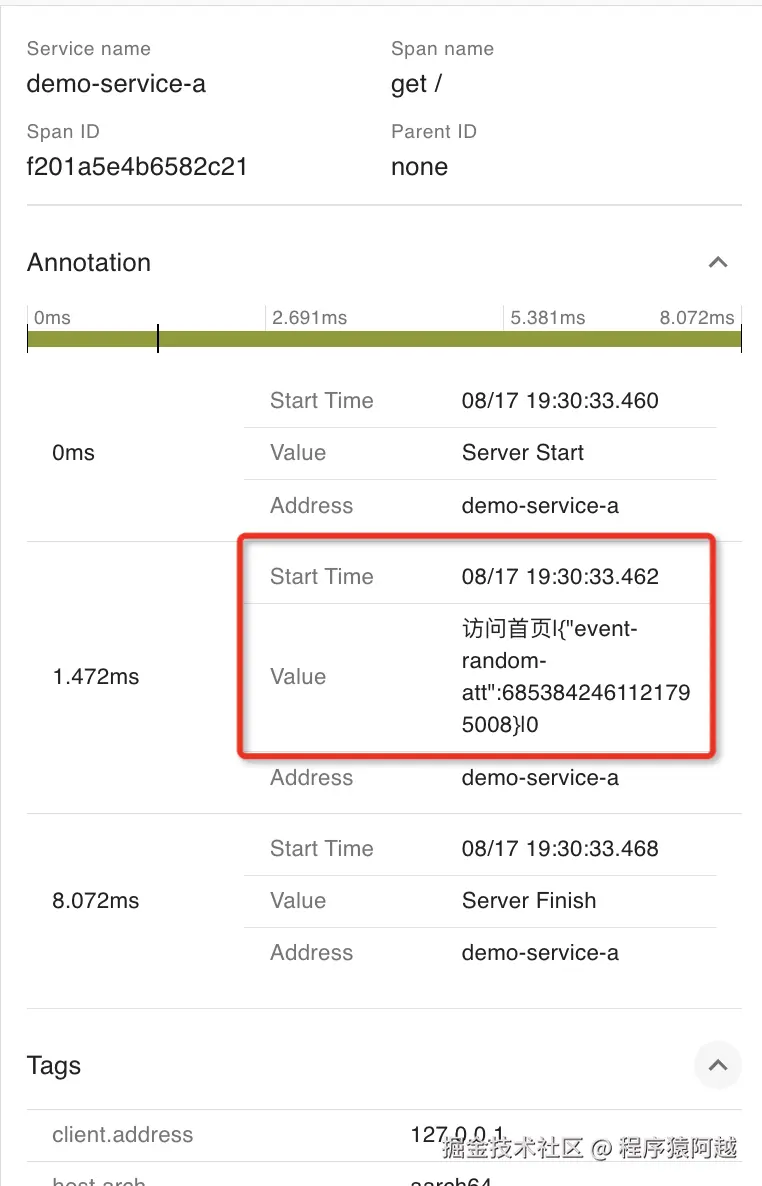 在Zipkin中,event在span的annotation中,非结构化展示。