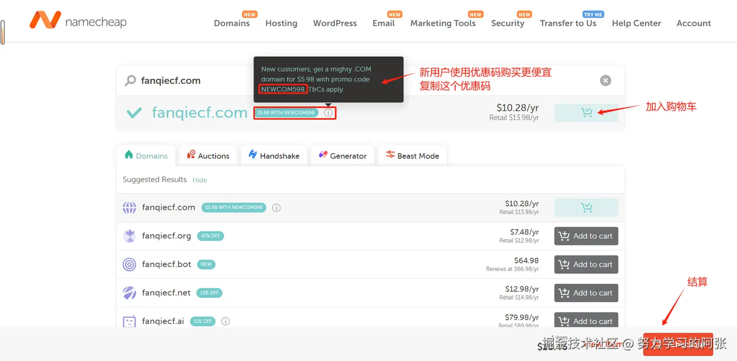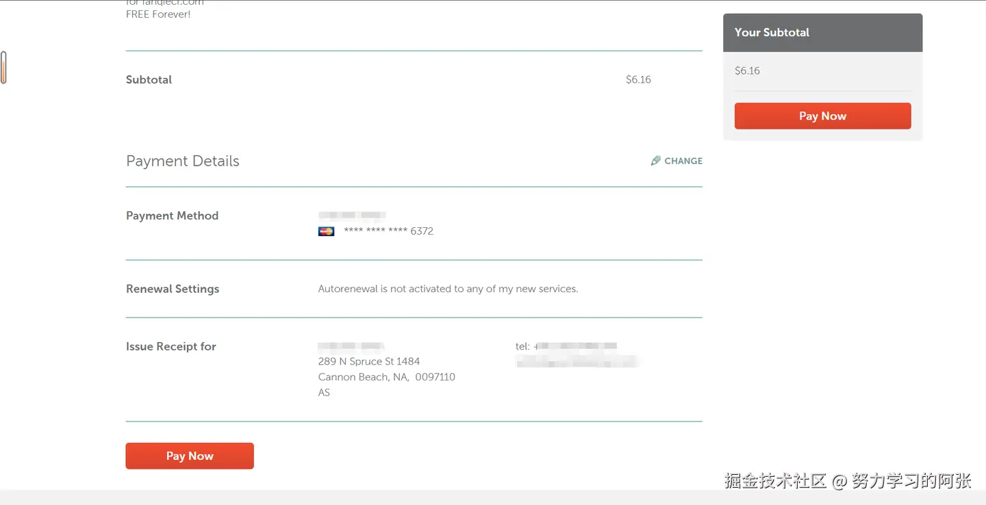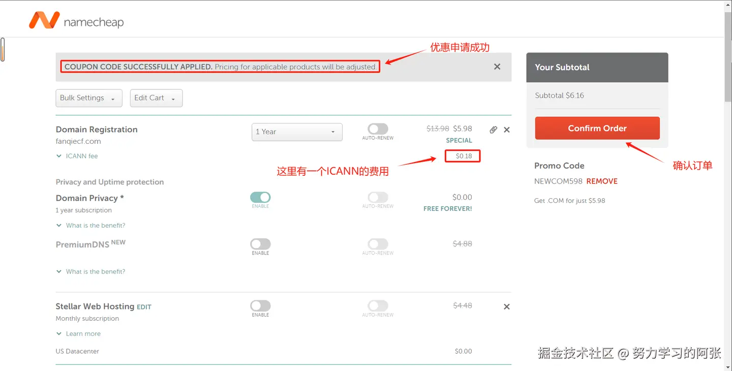 关闭自动续费选项,输入之前复制的优惠码,最后点击Apply