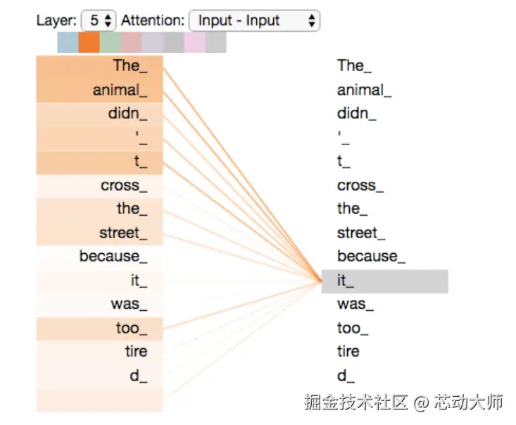 下图是模型的最上一层Encoder的Attention可视化图。这是tensor2tensor这个工具输出的内容。我们可以看到,在编码it的时候有一个Attention Head(后面会讲到)注意到了Animal,因此编码后的it有Animal的语义。