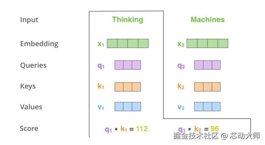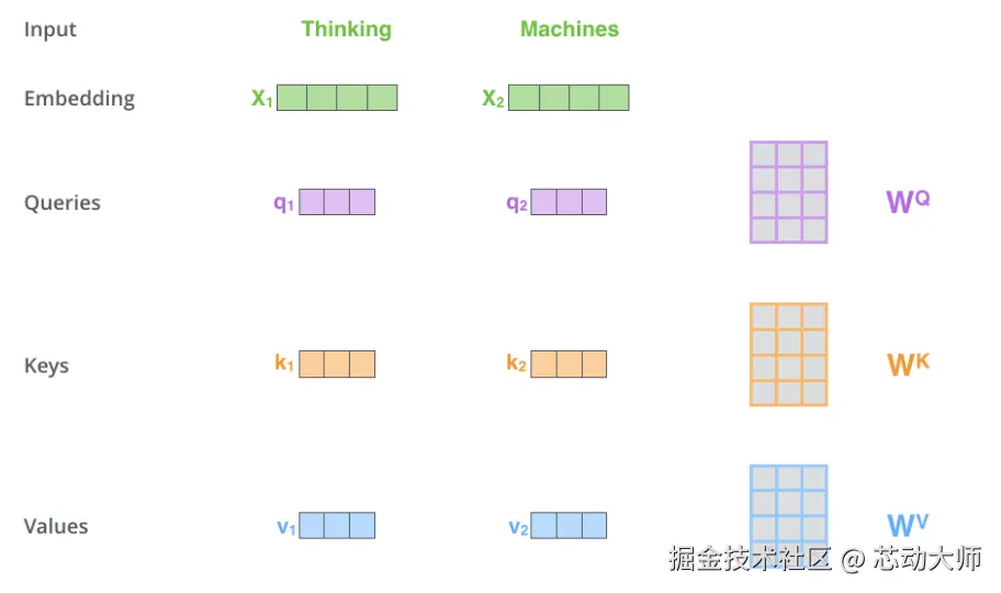 对于输入的每一个向量(第一层是词的Embedding,其它层是前一层的输出),我们首先需要生成3个新的向量Q、K和V,分别代表查询(Query)向量、Key向量和Value向量。Q表示为了编码当前词,需要去注意(attend to)其它(其实也包括它自己)的词,我们需要有一个查询向量。而Key向量可以认为是这个词的关键的用于被检索的信息,而Value向量是真正的内容。