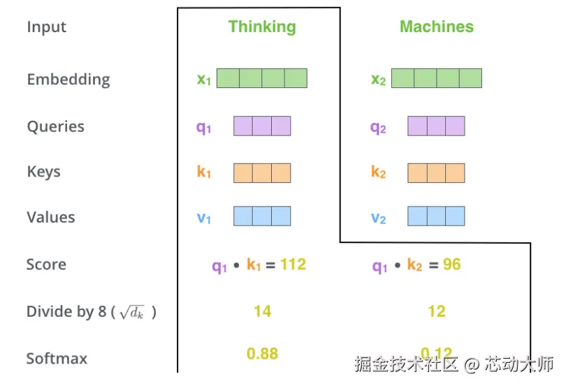 每个时刻t都计算出𝑄𝑡,𝐾𝑡,𝑉𝑡之后,我们就可以来计算Self-Attention了。以第一个时刻为例,我们首先计算𝑞1和𝑘1,𝑘2的内积,得到score,过程如下图所示。