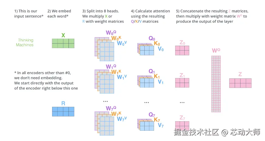 论文还提出了Multi-Head Attention的概念。其实很简单,前面定义的一组Q、K和V可以让一个词attend to相关的词,我们可以定义多组Q、K和V,它们分别可以关注不同的上下文。计算Q、K和V的过程还是一样,不过现在变换矩阵从一组(𝑊𝑄,𝑊𝐾,𝑊𝑉)变成了多组(𝑊𝑄0,𝑊𝐾0,𝑊𝑉0) ,(𝑊𝑄1,𝑊𝐾1,𝑊𝑉1)。如下图所示。