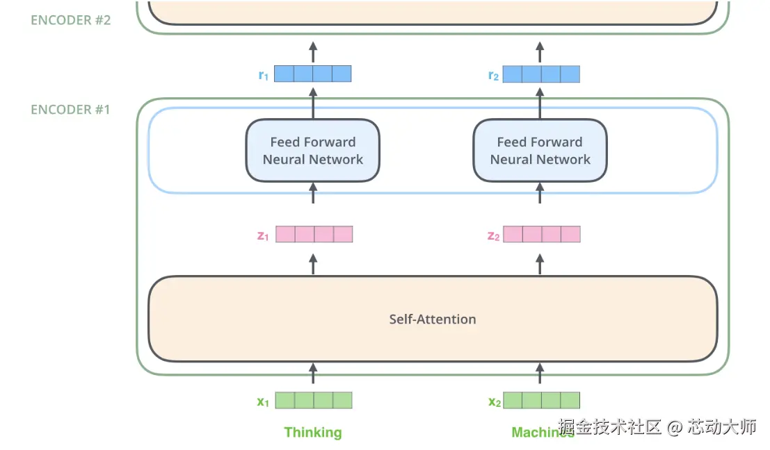 每一层的Encoder都是相同的结构,它由一个Self-Attention层和一个前馈网络(全连接网络)组成,如下图所示。