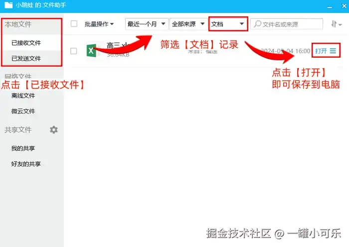 步骤2:筛选 【文档】 数据类型,勾选失效的QQ原文件,点击打开即可将失效的文件保存至电脑上。