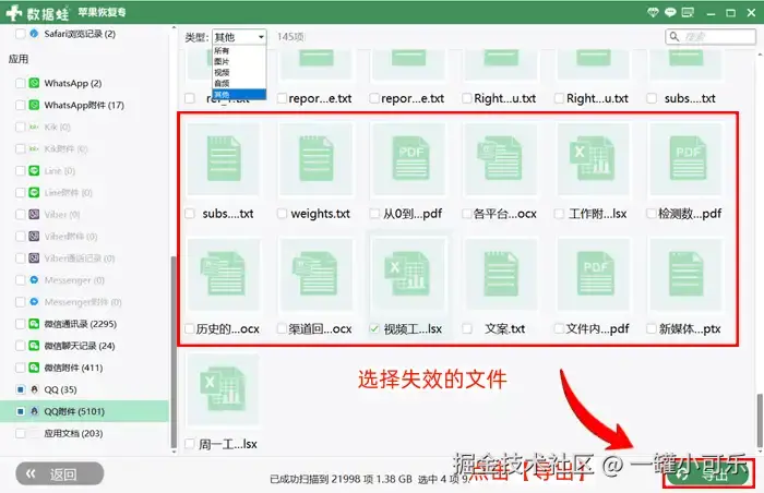 步骤3:在筛选出来的文件数据中,找到你想要恢复的失效的文件,并勾选,然后点击 【导出】 ,即可将文件导出至指定的电脑文件夹中。