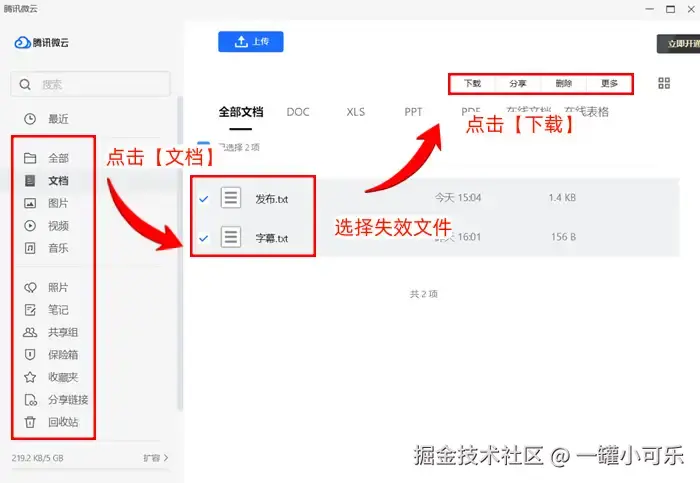 步骤2:进入微云界面后,点击 【文档】 选项,找到并勾选失效的文件,然后点击 【下载】 就行。