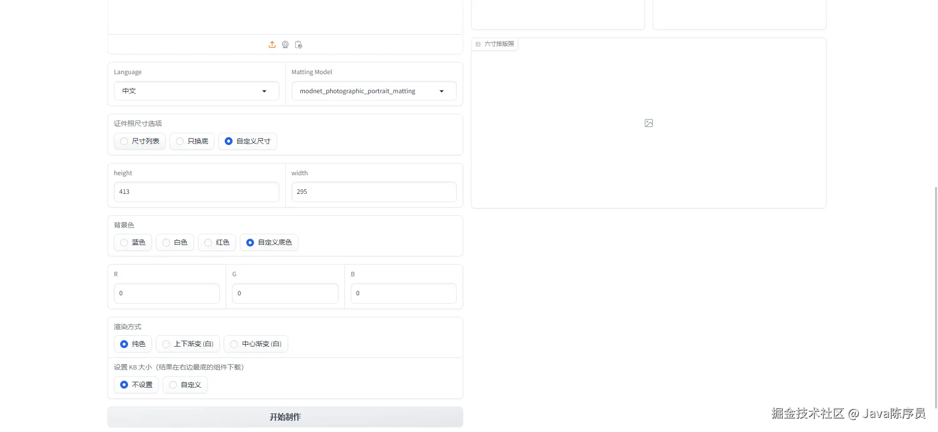 HivisionIDPhotos 提供了一个简单易用的 Web 界面供使用,我们只需要上传图像,选定好预设尺寸、背景色、渲染方式、设置 KB 大小等就能快速生成标准照、高清照和六寸排版照。