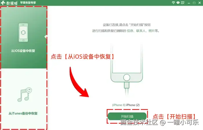 步骤1:将软件安装到电脑上之后,打开软件,将手机和电脑用数据线连接起来,然后选择 【从iOS设备中恢复】的扫描方式,并点击【开始扫描】 。
