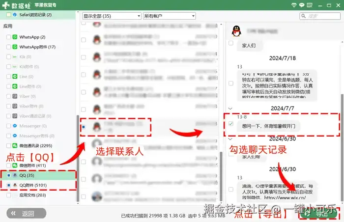步骤3:在软件显示的应用栏一侧,点击 【QQ】 ,选择相应的qq好友,找到被删除的qq聊天记录并勾选,再点击 【导出】 即可。