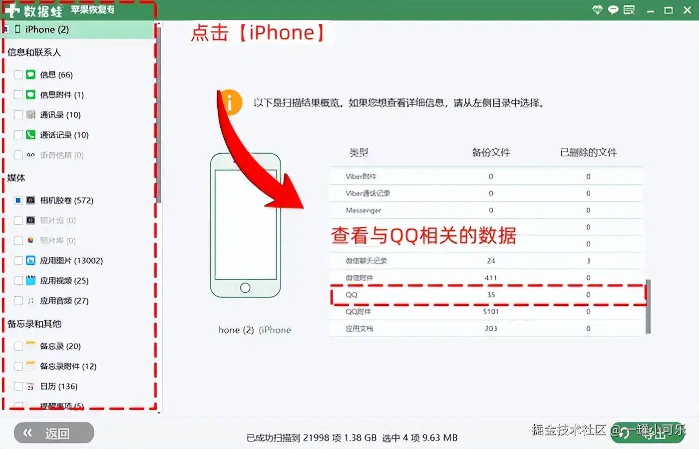 步骤2:在扫描结果界面中,点击 【iPhone】 设备选项,即可查看所有的可恢复的数据。