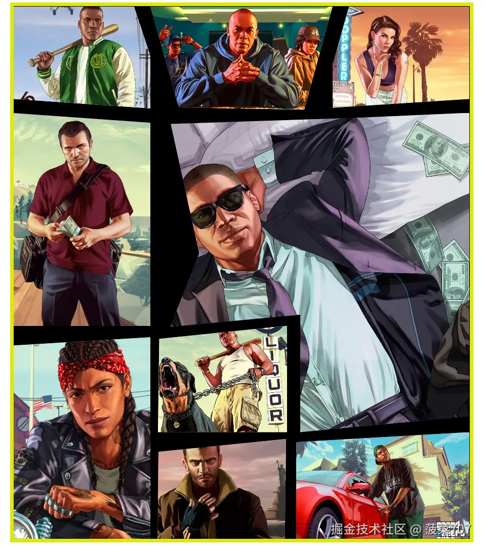 介绍:我们 上一章 基本介绍 gird布局的基本使用,我们现在使用grid布局+clip-path裁剪来进行实现 GTA5封面,不熟悉 grid布局 可以查看我的上一章文章,我们先看实现效果