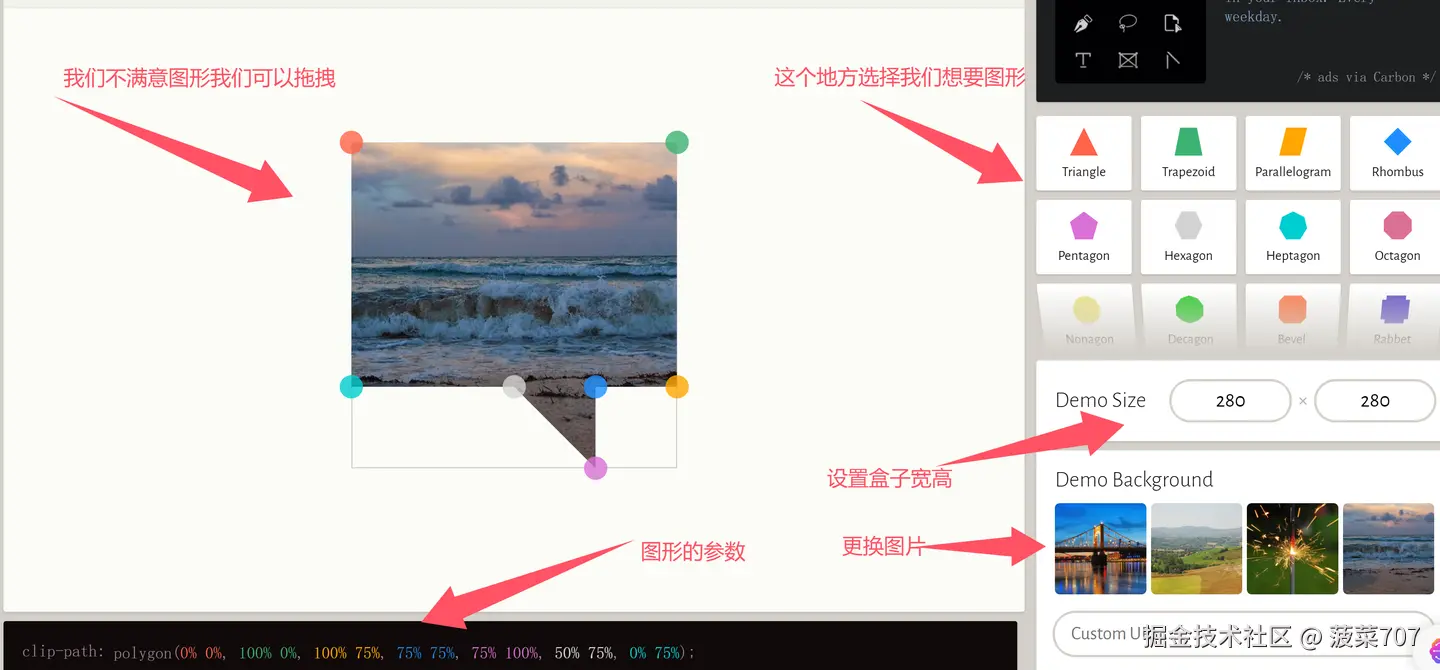 首先我要知道clip-path 是啥 它是实现裁剪元素,裁剪成我们想要的任意形状 如: 三角 形 五角星 菱形 不规则的形状 等,