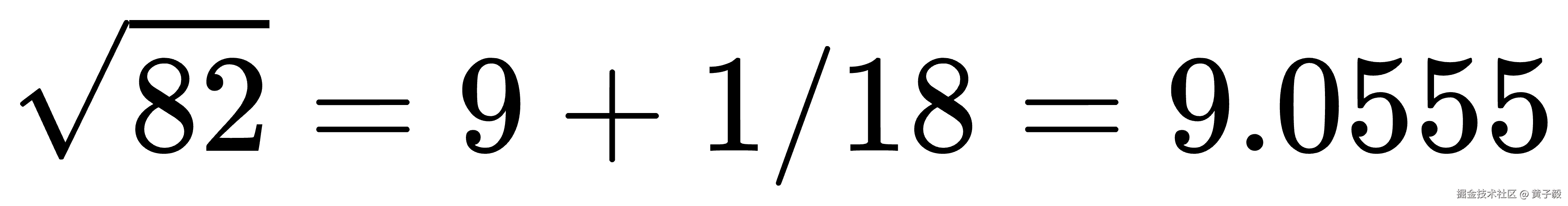 对于任意数字算根号,比如对数字 n 算根号,先找到一个数,这个数的平方最接近并小于根号内的数字,比如求根号 82,先找到 9 作为 a,接下来根据下面公式得到 b: